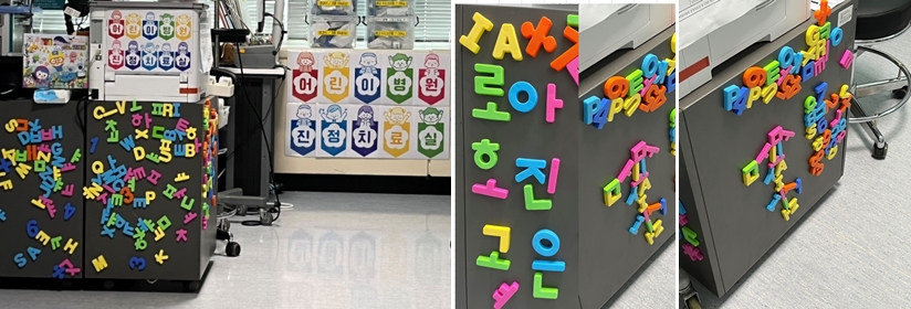 어린이병원 진정치료실 전담간호사인 저는 체온을 측정하는 순간부터 본격적으로 ‘수다쟁이’가 됩니다. “여보세요 놀이 해볼까?” “집에서도 해본 적 있지?” 쉼 없이 떠들며 아이의 관심을 분산시키려 노력하지만, 아이는 여전히 불안한 눈초리로 저를 쳐다봅니다. 체온 측정이 끝나면 빠르게 “안녕”을 외치며 손을 흔들며 거리를 둡니다. 그러면 몇몇 아이들은 그제서야 안심을 한듯 치료실 안의 자석판 숫자와 알파벳, 한글 자석들을 이러 저리 붙이며 잠시 이곳이 병원이라는 사실을 잊습니다. 제가 사비로 마련한 자석판에 관심을 가져줄 때면 더없이 고맙게 느껴집니다.